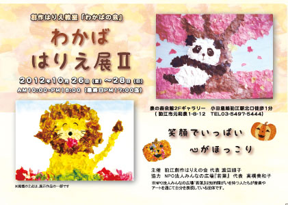 年賀状講座・サマースクール貼り絵うちわをつくろう! ◎小児病棟ボランティア【不定期】 NPO法人キッズアートプロジェクト ◎親子教室 てづくり倶楽部お助けママ主宰 2歳からできる親子体験 創作貼り絵 ワークショップ |